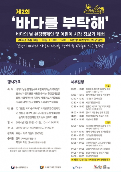 이번 행사는 대천항수산시장 상인회 문화관광형 육성사업단 주관으로 인근 어린이집과 유치원생 등 300여명이 참석 예정이며 현장에서도 행사 참여가 가능하다.