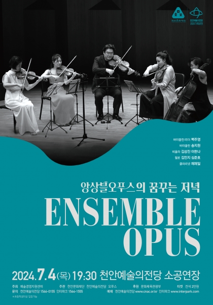 한편 ‘2024 공연예술 유통사업’은 공연예술 유통 시장의 활성화를 이끌고 나아가 지역 시민에게 문화 향유 기회를 확대하는 사업으로 ‘앙상블오푸스의 꿈꾸는 저녁’공연은 천안예술의전당 첫 공연을 시작으로 제주, 강릉, 순천, 익산, 함안, 광주, 울산 등 전국투어로 진행될 예정이다.