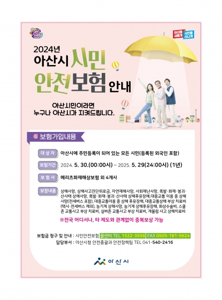 한편 아산시는 2023년 5월 30일부터 2024년 5월29일까지 모두 278명의 시민에게 1억 4천7백6십만원의 보험을 지급했다.