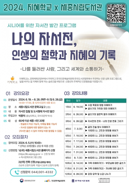 이번 프로그램은 문화체육관광부가 주최하고 한국문화예술위원회에서 주관하는 ‘도서관 지혜학교’ 사업의 일환으로 세종시에 거주하는 60세 이상 신중년의 주체적인 인문학적 활동을 지원한다.