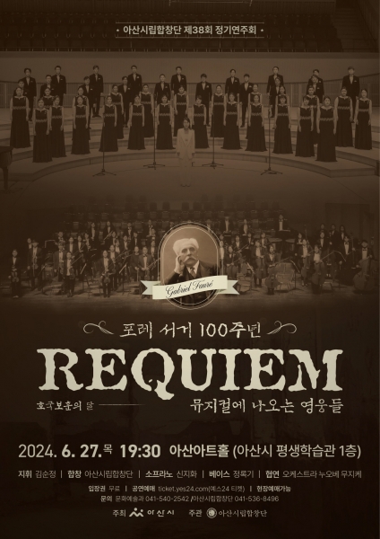 [Ytv영상스토리] 아산시립합창단은 2024년 6월 27일 아산아트홀에서 김순정 지휘자의 지휘로 제38회 정기연주회 ‘포레 레퀴엠 – 뮤지컬에 등장하는 영웅들’을 공연한다.