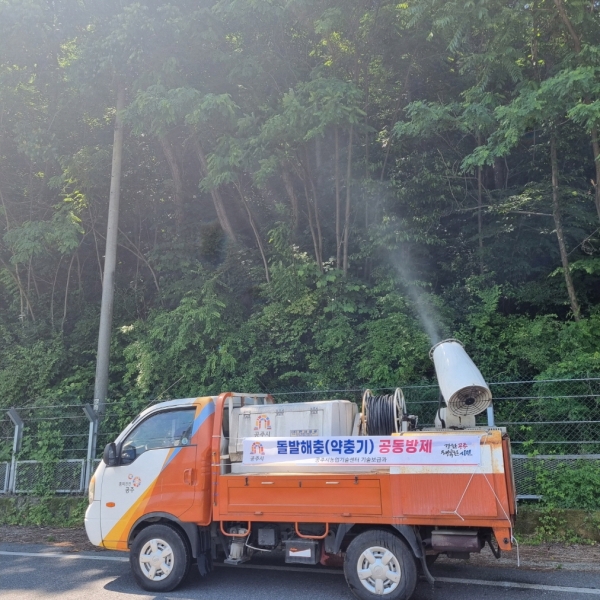 돌발해충 특성상 한 번에 대규모로 방제해야 효과를 극대화할 수 있기에 공주시 기술보급과와 산림공원과의 협업으로 광역살포기와 방제요원 6명을 투입해 과수와 산림에 대한 동시 공동방제를 진행했다.