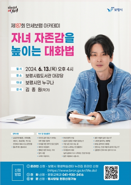 [Ytv영상스토리] 보령시는 오는 13일 오후 4시 보령시립도서관에서 김종원 작가를 초청해‘자녀 자존감을 높이는 대화법’이라는 주제로 187회 만세보령 아카데미를 개최한다.