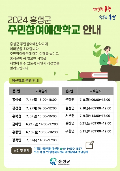 김윤태 기획감사담당관은 “이번 교육을 통해 주민들이 예산편성 과정에 좀 더 수월하게 참여할 수 있게 되길 바란다”며“주민의 참신한 아이디어를 바탕으로 홍성의 발전상을 그려나갈 수 있기를 기대한다”고 전했다.