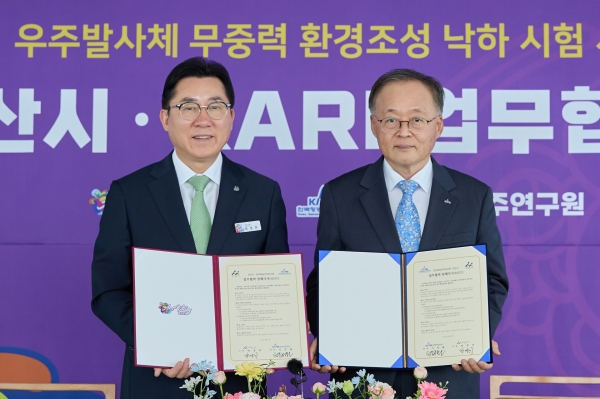 [Ytv영상스토리] 아산시는 7일 아산그린타워에서 한국항공우주연구원과 우주발사체 무중력환경 조성 낙하 시험 시설 구축을 위한 협약식을 개최했다.