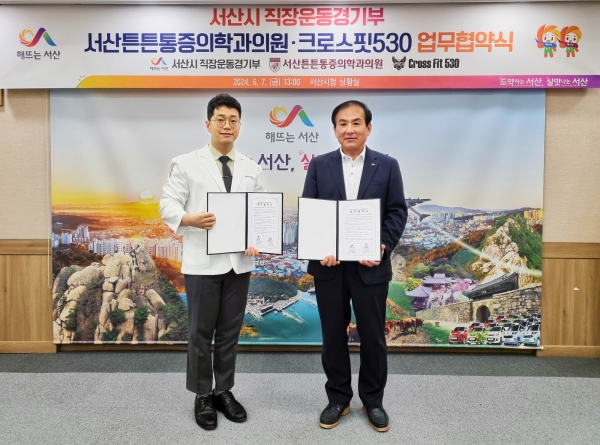 이날 개최된 업무협약식에는 서산시 직장운동경기부 단장 김일환 서산시 복지문화국장, 서산튼튼통증의학과의원 박상우 대표원장, 크로스핏 530 강대환 대표 등 관계자 9명이 참석했다.