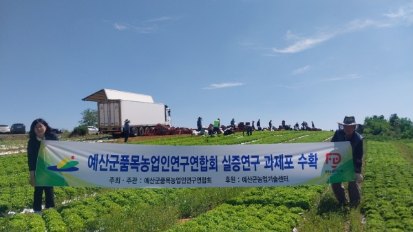 [Ytv영상스토리] 예산군품목농업인연구연합회는 고덕면 상궁리 일원 실증연구 과제포장에서 회원 60여명이 참석한 가운데 로메인 상추 수확 작업을 실시했다고 10일 밝혔다.