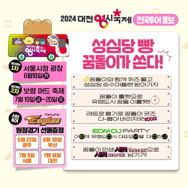 대전빵차 투어는 대한민국 대표 여름축제인‘대전 0시축제' 와‘꿈씨 패밀리 캐릭터’홍보 이미지를 래핑한 45인승 대형버스가 전국 방방곡곡을 방문해 대전의 브랜드가치를 알리는 이벤트이다.