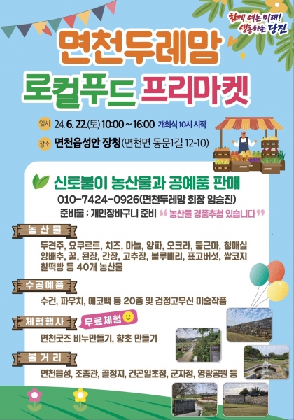 이번 행사는 22년부터 시작되어 1년에 상·하반기 2회에 걸쳐 진행되고 있는 프리마켓 행사로 두견주, 요구르트, 치즈, 마늘, 양파, 오크라, 둥근 마, 청매실, 양배추, 꿀, 된장, 간장, 고추장, 블루베리, 표고버섯, 쌀코지, 찰떡 빵 등 40개 농산물과 수건, 파우치, 에코백 등 20종의 수공예품 및 검정고무신 미술작품을 만나 볼 수 있다. 면천 굿즈 비누 만들기, 향초 만들기 등의 체험행사와 우유 무료 시식도 같이 진행한다.