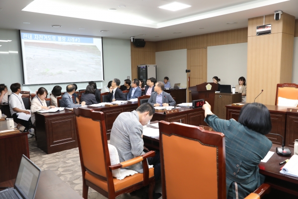 도시건축과 소관 감사는 이정순 의원이 “부서에서 제출한 자전거 도로 점검 현황 자료에 의하면 점검 결과 미흡한 사항은 모두 조치한 것으로 되어있으나, 본 의원이 확인한 바에 따르면 내포신도시 내 삽교읍 일원에서는 여전히 볼라드 불량, 인도 보도블록 파손, 인도 위 전선 방치 등 적치물이 확인되어 자전거 이용 군민의 안전을 위협하고 있다”고 지적하며 “자전거 안전사고 방지를 위해 지속적인 관리를 당부한다”고 말했다.