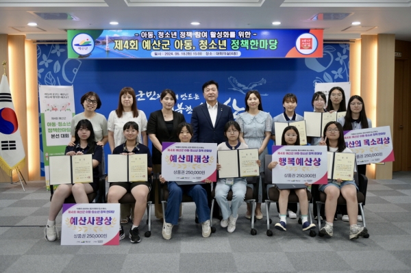 정책한마당에 참가한 4개 팀과 발표주제는 △‘고덕이들’의 아이들이 위험해요 △‘우리는 하나’ 예산군 청소년수련환 활성화 △‘HAPPY DAY’ 어둠을 밝혀줄 가로등 △‘예흥’의 누구나 쉬운 예산 등 아동·청소년들이 지역사회에서 실제로 겪은 문제점과 해결 방안을 직접 제안했다.