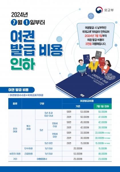 이에 여권 발급 비용이 유효기간 10년의 전자여권 58면은 현행 5만3000원에서 5만원으로 26면은 현행 5만원에서 4만7000원으로 각각 낮아진다.