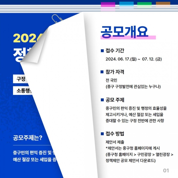 공모 주제는 중구민의 편익 증진 및 행정의 효율성을 제고시키거나, 예산절감 또는 세입을 증대할 수 있는 구정 전반에 관한 사항으로 다음 달 12일까지 전국민을 대상으로 중구청 누리집을 통한 온라인 접수로 진행된다.