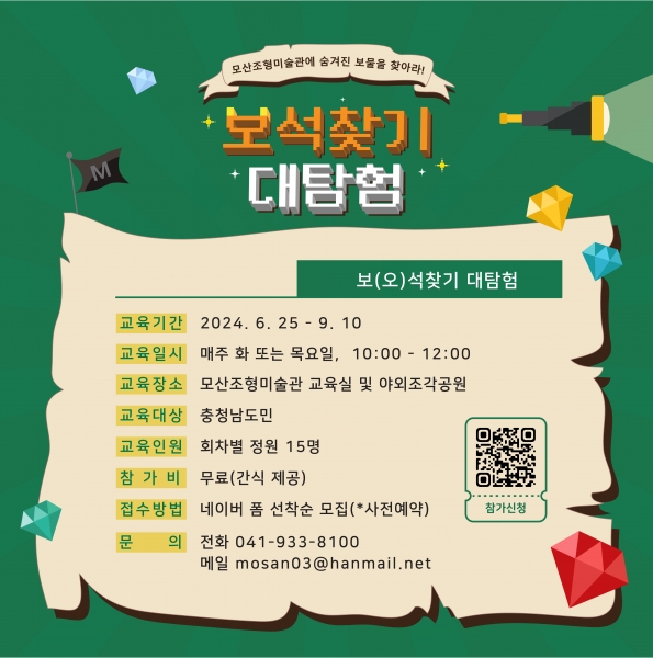 [Ytv영상스토리] 보령시 모산조형미술관은 6월 25일부터 9월 10일까지 충남도민을 대상으로 2024문화예술교육사 현장 역량강화 지원사업 ‘보석찾기 대탐험’프로그램을 운영한다.