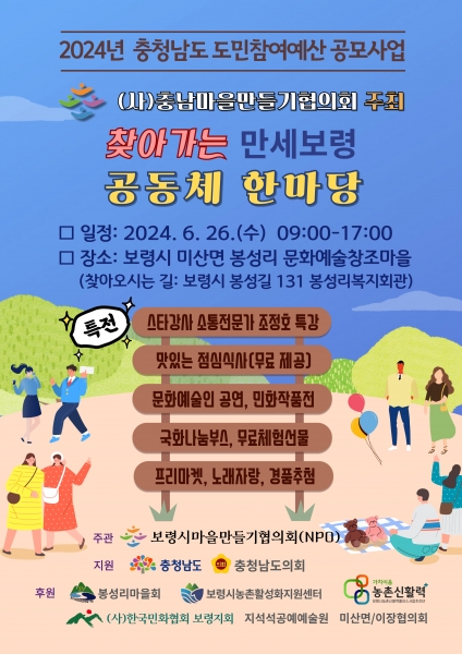 이번 행사는 충남마을만들기협의회가 주최하고 보령시마을만들기협의회가 주관하며 스타강사인 조정호 소통전문가의 초청특강과 함께 다양한 문화예술공연과 민화작품 전시회가 준비돼 있다.