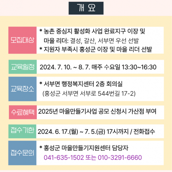 회차별 교육 내용은 △정부의 농촌 마을 활성화 전략과 미래 발전 방향 △마을 조직 및 마을규약 작성관리 △읍·면 거점 공간에 대한 활용방안 △사업 완료지구 우수마을 선진지 견학 △마을별 마을규약 및 문제점 보완사항 토의 순으로 진행된다.