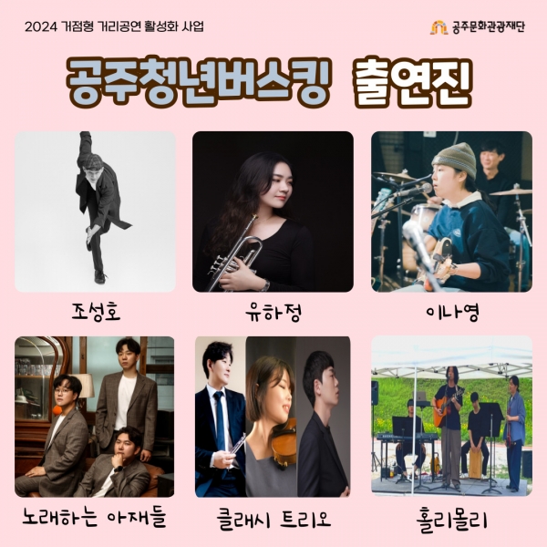 ‘공주청년버스킹’은 공주문화관광재단에서 올해 처음 추진하는 신규사업으로 지난 4월, 공주시의 젊은 예술인과 및 단체를 대상으로 오디션을 통해 총 6개의 팀의 버스킹 참여자를 모집했다.