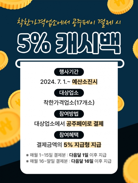 이에 따라 착한가격업소에서 공주페이로 물건을 구매할 경우 기본 선할인 10%에 결제금액의 5%를 캐시백으로 적립시켜 준다.