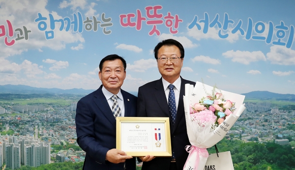 김용경 의원이 대한민국지방의정봉사상을 수상한 후 기념 촬영을 하고 있다.(사진 왼쪽부터 김맹호 서산시의회 의장, 김용경 서산시의원)