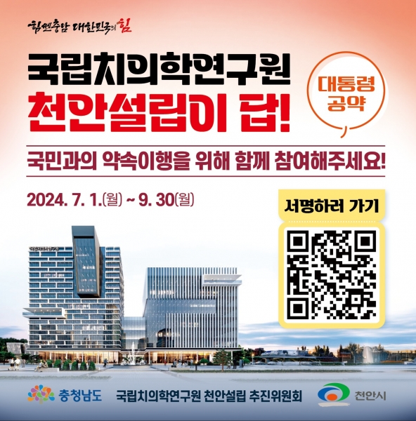 시는 충청남도와 함께 9월까지 ‘제20대 대통령 충남지역공약 국립치의학연구원 설립’ 조속 이행을 위해 범도민 100만명 서명운동을 실시한다.