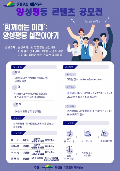 [Ytv영상스토리] 예산군과 예산군기초젠더거버넌스는 양성평등 문화확산을 위한 홍보·정책 추진의 일환으로 ‘2024년 예산군 양성평등 콘텐츠 공모전’을 개최한다.