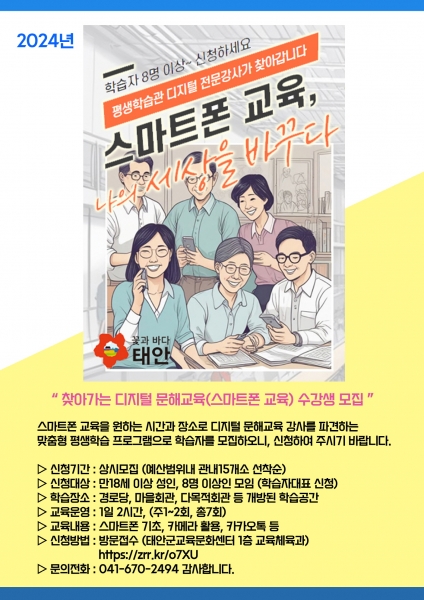 태안군, “스마트폰 활용법 배우세요” 디지털 문해교육 신청·접수