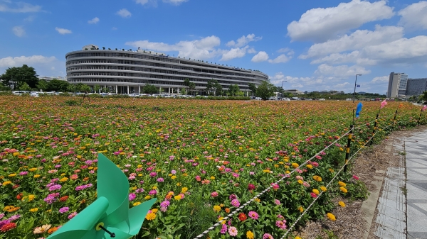 어진동 행정복지센터는 시 100대 마을정원 사업의 일환으로 지난 4월부터 산업통상자원부 인근 9,132㎡의 공간에 백일홍을 파종했다.