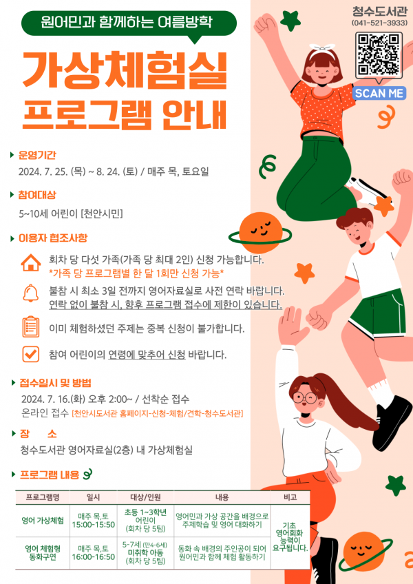 [Ytv영상스토리] 천안시 청수도서관은 2024년 7월부터 8월 2개월간 ‘원어민과 함께하는 여름방학 가상체험실 프로그램’을 지속 운영한다고 9일 밝혔다.
