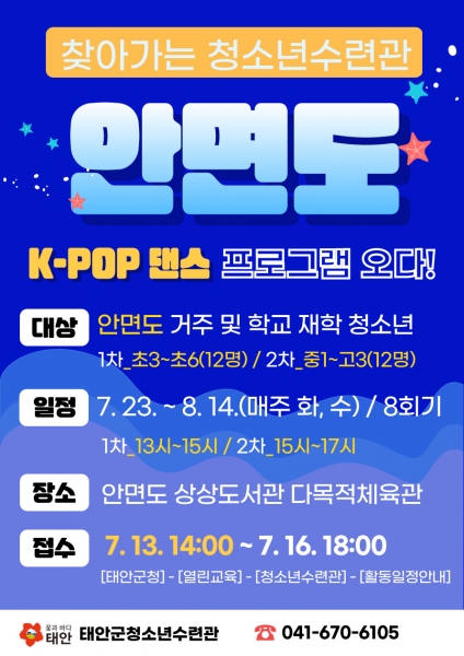군은 오는 7월 23일부터 8월 14일까지 4주간 총 8회에 걸쳐 안면도 상상도서관 다목적체육관에서 케이팝 댄스 프로그램 ‘안면도에서 펼쳐지는 춤의 무대’를 진행키로 하고 13일부터 16일까지 신청 접수를 받는다고 밝혔다.