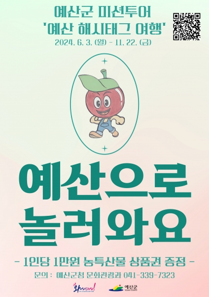 군 관계자는 “‘예산 해시태그 여행’ 미션 투어를 통해 예산을 방문하는 관광객이 지역의 다양한 관광명소를 즐기고 추억을 쌓는 기회가 되길 바란다”며 “사업이 활성화돼 지역 경제와 관광 업계에 큰 도움이 되고 앞으로 더 많은 여행객이 관심을 갖고 참여하길 기대한다”고 밝혔다.