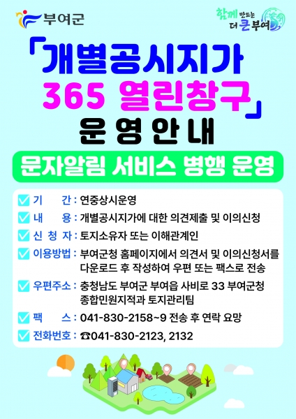 아울러 부여군은 인터넷 사용이 어렵거나 바쁜 일상으로 개별공시지가를 확인하지 못하는 부여군민을 위해 '개별공시지가 문자알림서비스'를 시행하고 있다.