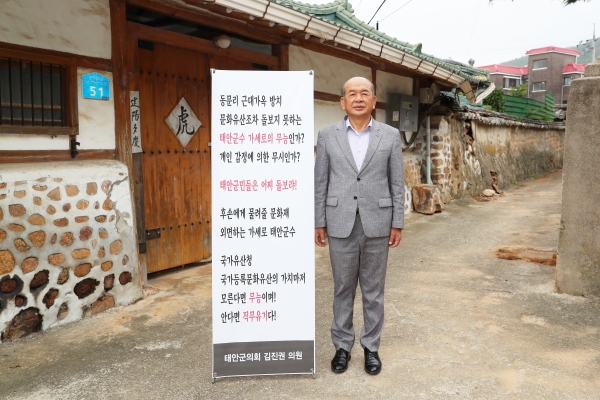 끝으로 김진권 의원은 가세로 태안군수의 책임 있는 자세를 요구하며 “문화유산 발굴 복원도 중요하지만, 더 중요한 것은 현재 있는 태안군 전체의 문화유산 관리와 보존이며 이를 소홀히 해서는 안 된다”며 동문 근대한옥 사업비 집행과 적극적인 대책 마련을 촉구하기 위해 1인 시위는 계속할 계획이라고 밝혔다.