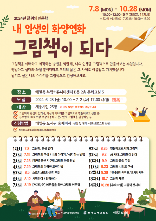 세종시립도서관 관계자는 “이번 길 위의 인문학 사업 운영을 통해 시민들이 그림책으로 치유하고 소통하는 기회가 되길 바란다”며 “앞으로도 시민들께서 자부심을 가지고 적극적으로 참여할 수 있는 독서문화 프로그램을 지속적으로 마련하겠다”고 밝혔다.