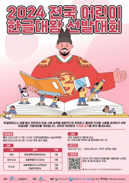 최민호 세종시장은 “백성을 사랑하는 마음으로 한글을 창제한 세종대왕의 정신을 기리고 전국 어린이들이 아름다운 우리말의 소중함을 아는 계기가 될 것”이라며 “많은 어린이가 참여해 우리말 실력을 맘껏 뽐내기를 기대한다”고 말했다.