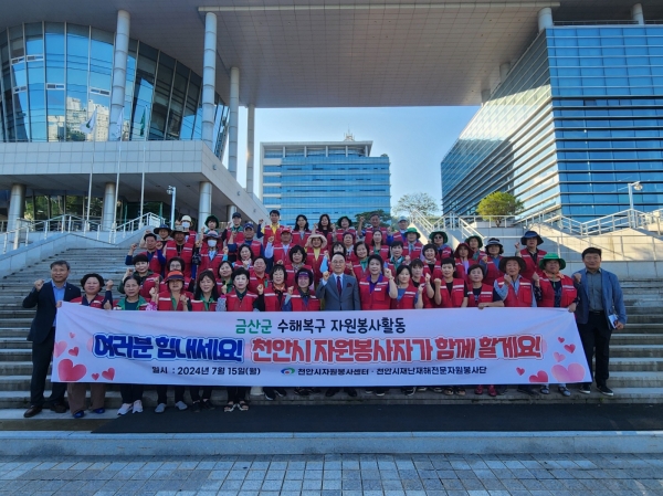 천안시새마을회, 한국자유총연맹천안시지회, 청룡동방재단, 삼육지역사회봉사회, 성거여성의용소방대, 백석지대자율방범대 등 10개 자원봉사단체 자원봉사자 50여명은 15일 금산군을 찾아 수해 복구를 지원했다.