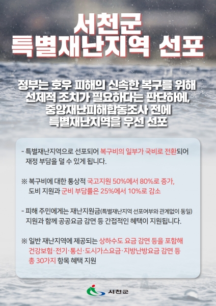 아울러 정부의 신속한 특별재난지역 선포로 복구비 일부가 국비로 전환되어 서천군의 재정 부담을 덜고 피해 주민에게는 재난지원금 지원과 함께 공공요금 감면 등의 혜택이 추가로 지원될 수 있어 한시름 놓을 수 있게 됐다며 특별재난지역 선포의 의미를 설명했다.
