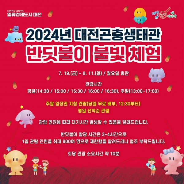 임성복 대전시 농생명정책과장은 “도심 속 시민들이 평소에 볼 수 없는 반딧불이의 모습을 직접 관람하고 체험할 수 있도록 준비했다”며 “아름다운 반딧불이 뿜는 빛의 향연을 마음껏 감상하시기를 바란다”고 말했다.