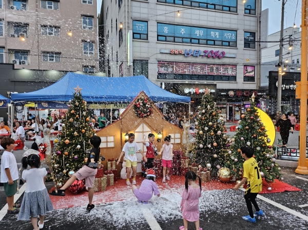 행사에는 월산상가 번영회를 비롯해 홍성군 지속발전협의회, 청운대학교 학교기업 이음, 혜전대학교 푸드트럭, 종합예술협동조합 ‘콩콩콩’ 등 민관학이 협력해 다채로운 프로그램이 진행되고 한여름에 느끼는 이색적인 크리스마스 분위기는 방문객들의 큰 호응을 얻었다.