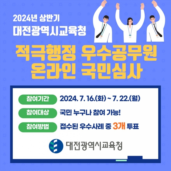 [Ytv영상스토리] 대전시교육청은 7월 16일부터 22일까지 2024년 상반기 적극행정 우수사례를 선발하기 위해 온라인 국민심사를 실시한다고 밝혔다.