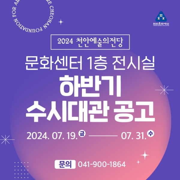 대관 가능 기간은 8월부터 12월까지 월별로 상이하며 지원 대상은 천안시 문화예술 발전에 기여할 수 있는 전문예술인 및 전시실 목적 취지에 맞는 전시가 가능한 개인·단체는 누구나 신청할 수 있다.