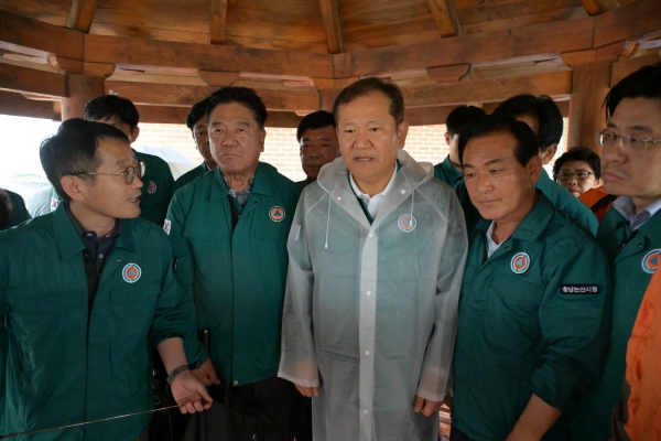 18일 침수 피해가 발생한 벌곡면 어곡리를 찾은 이상민 행정안전부 장관은 백성현 논산시장과 함께 어곡교, 침수피해 농가, 마을회관에 대피중인 마을주민 등을 방문해 현장을 점검하고 위로의 말을 건넸다.