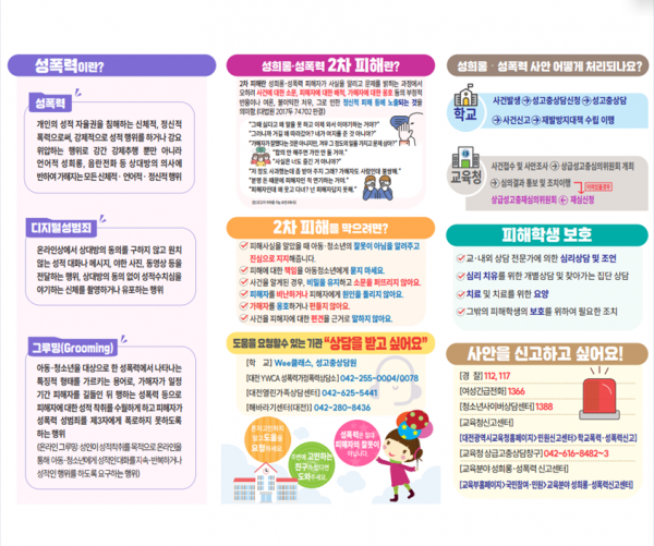 리플릿은 성폭력의 유형 및 정의, 성희롱·성폭력 2차 피해의 정의와 예방법, 사안처리 절차, 학생과 보호자가 알아야 할 디지털성범죄 예방안전수칙, 도움을 요청할 수 있는 상담기관 및 신고 방법 등 다양한 자원과 서비스에 대한 정보를 알기 쉽게 제작했다.