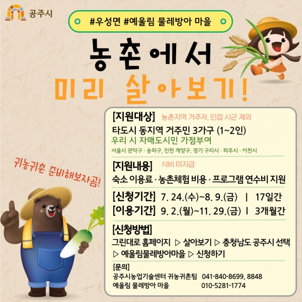 시는 신청자를 대상으로 대면 심사를 거쳐 최종 3가구를 선정할 예정으로 선정된 가구는 9월부터 11월까지 3개월 동안 우성면 봉현리 예울림물레방아마을에서 함께 생활하게 된다.