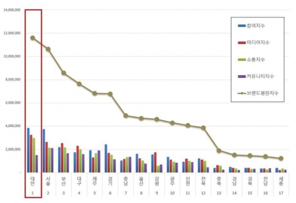 1위를 차지한 대전 브랜드는 참여지수 3,846,585 미디어지수 3,250,915 소통지수 2,992,719 커뮤니티지수 1,526,165가 되면서 브랜드평판지수 11,616,383으로 분석됐으며 지난 6월 브랜드평판지수 10,316,474와 비교해보면 12.60% 상승했다.