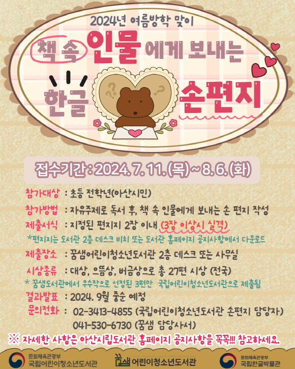 아산시 꿈샘어린이청소년도서관, 책 속 인물에게 보내는 손편지 공모