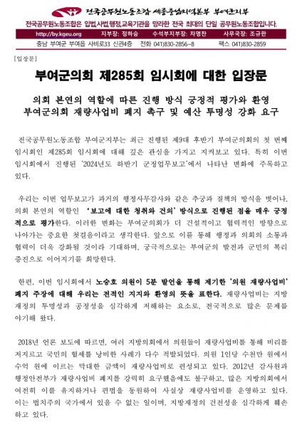 부여군지부는 5분 발언을 통해 밝힌 노승호 의원의 '의원 재량사업비' 폐지 주장에 대해 전적인 지지와 환영의 뜻을 표했다.