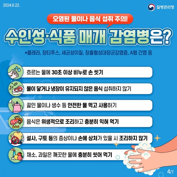 특히 7월은 장마가 시작되고 습한 날씨 탓에 병원성 미생물 증식이 활발해져 오염된 물과 음식 섭취로 인한 수인성·식품 매개 감염병에 각별한 주의가 필요하다.