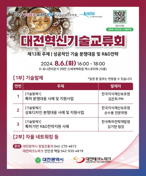 이번 교류회는 ‘성공적인 기술 분쟁 대응 및 R&D 전략’을 주제로 한국지식재산보호원 김은희 PM, 손수용 전문위원과 한국특허전략개발원 김기현 팀장을 초청해 사례를 통한 기술분쟁 대응 및 R&D전략 지원 사례에 대해 논의할 예정이다.