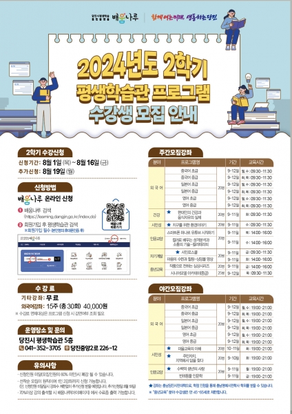 2024년 2학기 프로그램은 지난 1학기에서 호응을 얻었던 강좌와 신규 강좌를 고루 편성해 개편했으며 교육은 9월 1일부터 12월 19일까지 당진시 평생학습관에서 운영된다.