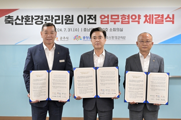 시에 따르면, 최원철 시장은 31일 도청 소회의실에서 김태흠 도지사, 문홍길 축산환경관리원 원장과 ‘축산환경관리원 청사 이전을 위한 업무협약’을 체결했다.